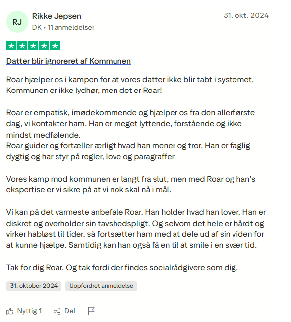 Denne sag viser, hvor afgørende det er, at forældre i lignende situationer har en rolig og kompetent støtte ved hånden – så de ikke står alene i kommunens afgørelser.